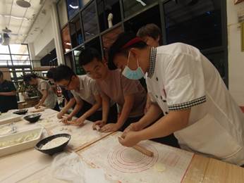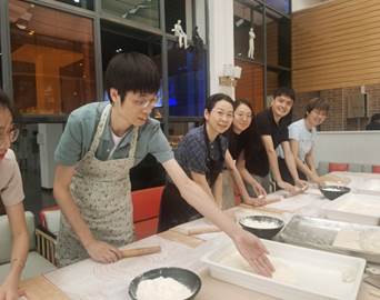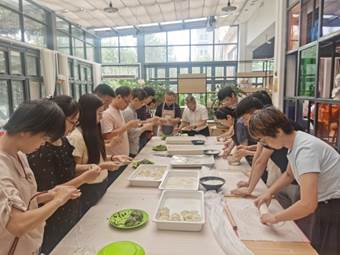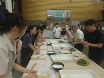 在准备饺子宴过程中,校园时光餐吧的师傅们为青年老师提供技术指导,示范包饺子的技巧。赵书记、肖经理也一边包饺子一边与老师们聊家常、谈美食。大家在一片欢声笑语中渡过了一个愉快的中午。