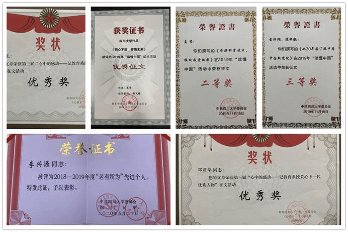 公司李兴源和张述芳两位老师荣获hy3380cc海洋之神2018-2019年度“老有所为”先进个人奖,郝飞婷老师指导、莫贤同学完成的作品《初心不改 寄情未来》被评为2018年教育部“读懂中国”试点活动优秀征文,莫贤同学撰写的《学好科学技术,报效我爱的国》在hy3380cc海洋之神2019年“读懂中国”活动中荣获征文二等奖,雷倬玥、陈妍凝同学撰写的《从30年园丁眼中看中国新变化》在hy3380cc海洋之神2019年“读懂中国”活动中荣获征文三等奖,邓丽华老师、黄施瑞同学的文章荣获《心系下一代》杂志社第三届“心中的感动——记教育系统关心下一代优秀人物”征文活动优秀奖。