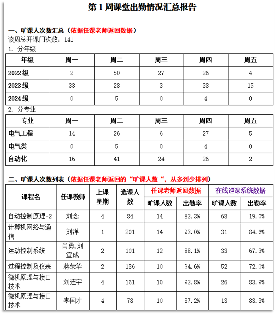 经教务处授权,本期公司通过“大川学堂-教学巡课”系统实时监控本学院开设课程的授课情况,并且要求任课教师课堂中严格进行考勤,并在课后及时向教学科上交缺勤员工信息。教学科逐日汇总后转给学工组,以便及时发现异常,通知相关人员进行整改。
