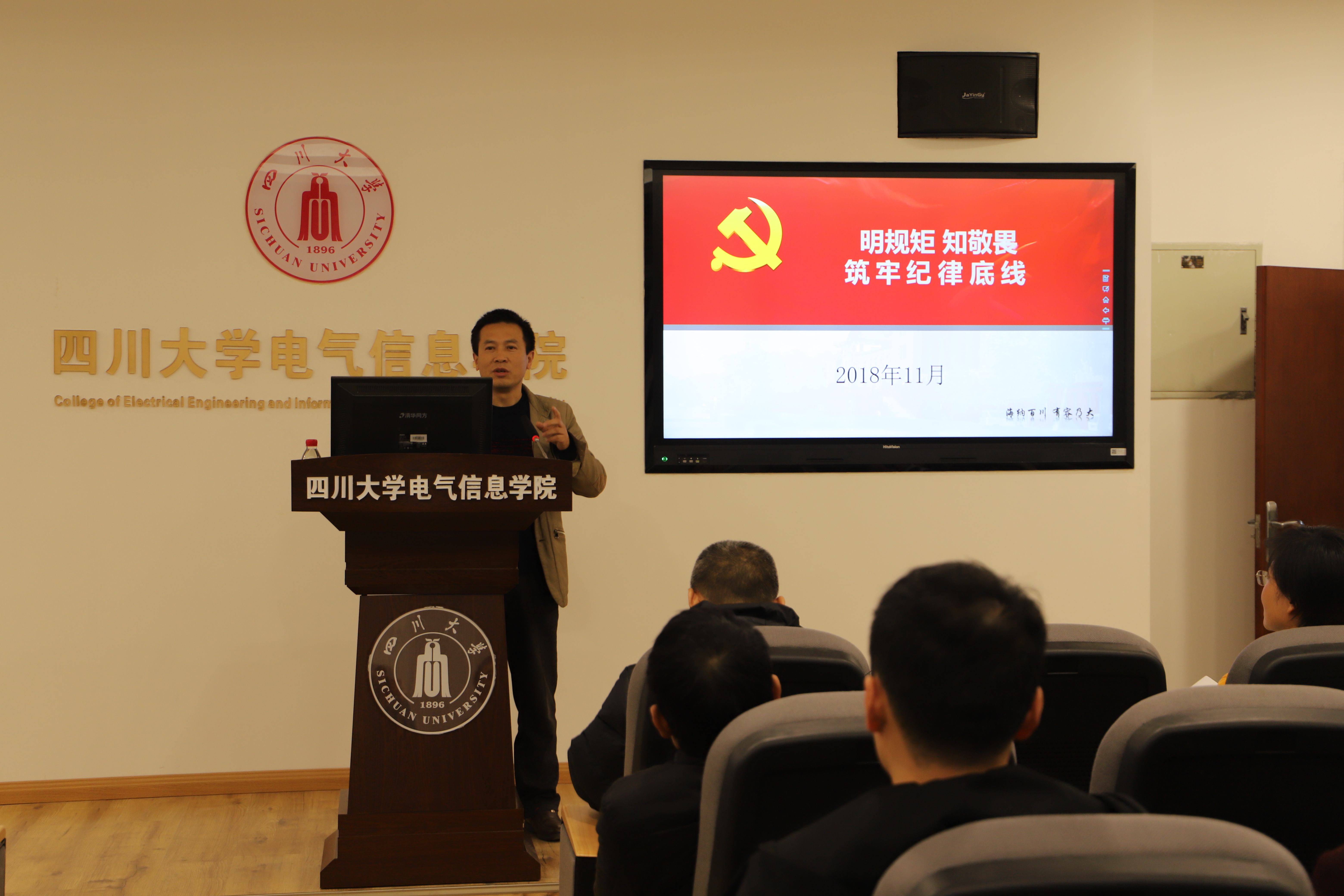 11月23日下午,电气信息学院纪委特邀校纪委副书记滕文浩同志莅临公司为学院全体教师党员举办学习《中国共产党纪律处分条例》(2018年修订版)宣讲会。此次宣讲会的主题是“明规矩 知敬畏 筑牢纪律底线”。宣讲会在基础教学楼B206学院报告厅举行,学院全体在职党员参加了此次宣讲会。会议由电气信息公司党委副书记兼纪委书记张英敏同志主持。