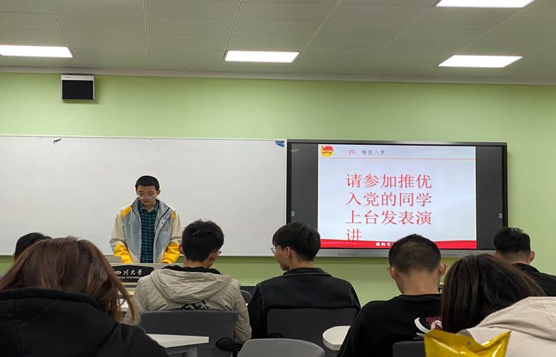 随后,团支书王一帆同学为大家讲解了共产党艰辛而光荣的革命历史,并为大家播放了革命视频,通过观看视频加深对革命精神的理解与感悟。最后,在团支书的组织下,团支部四名同学依次上台演讲,竞选入党积极分子,综合团支部团员的意见确定支部推优入党名单后,本次团日活动圆满结束。