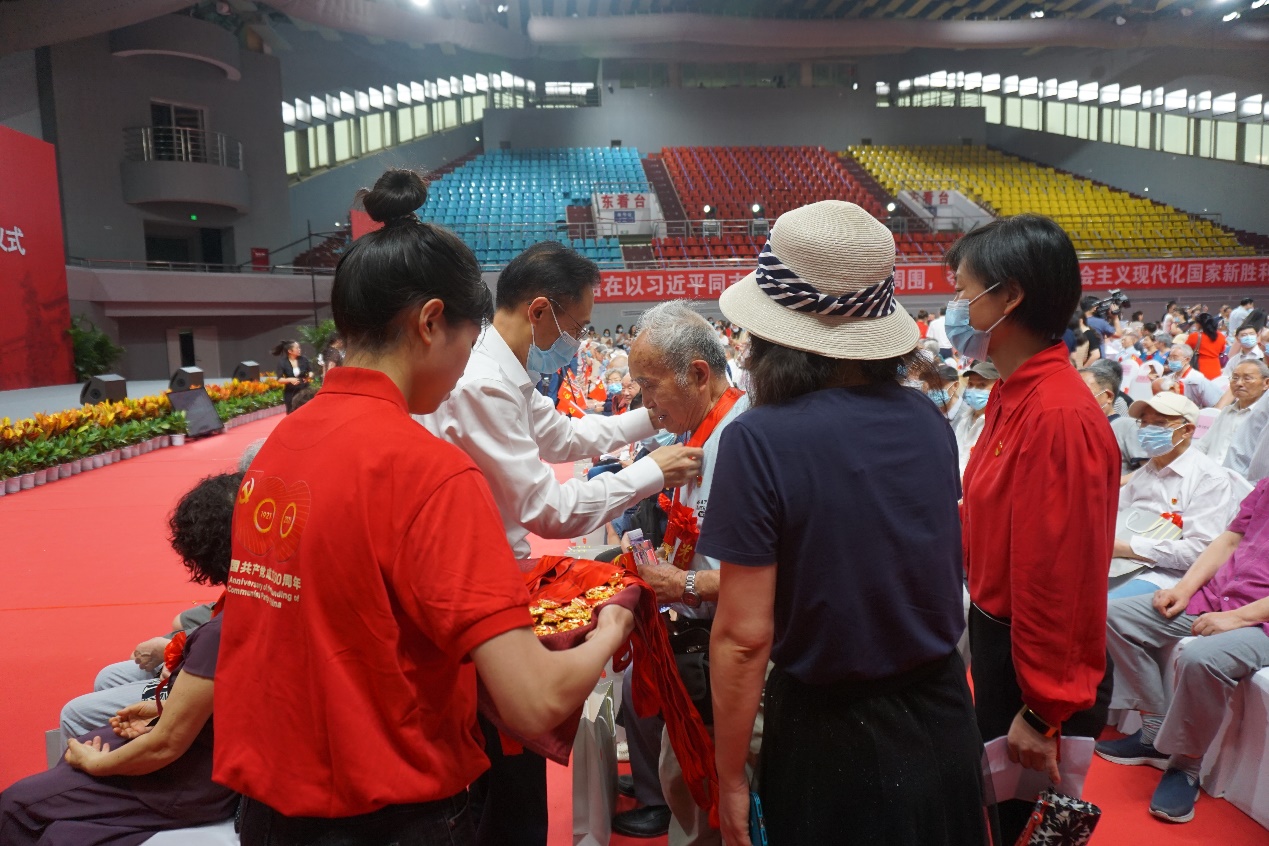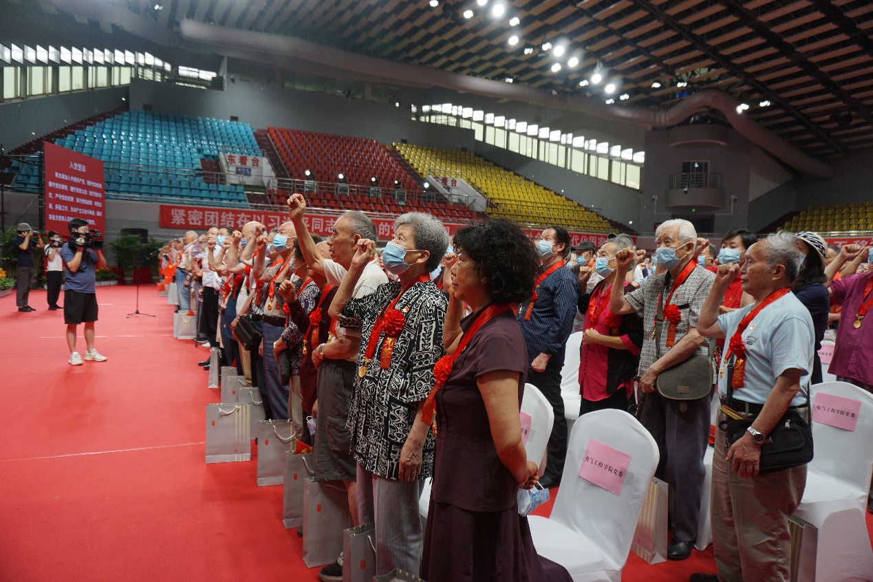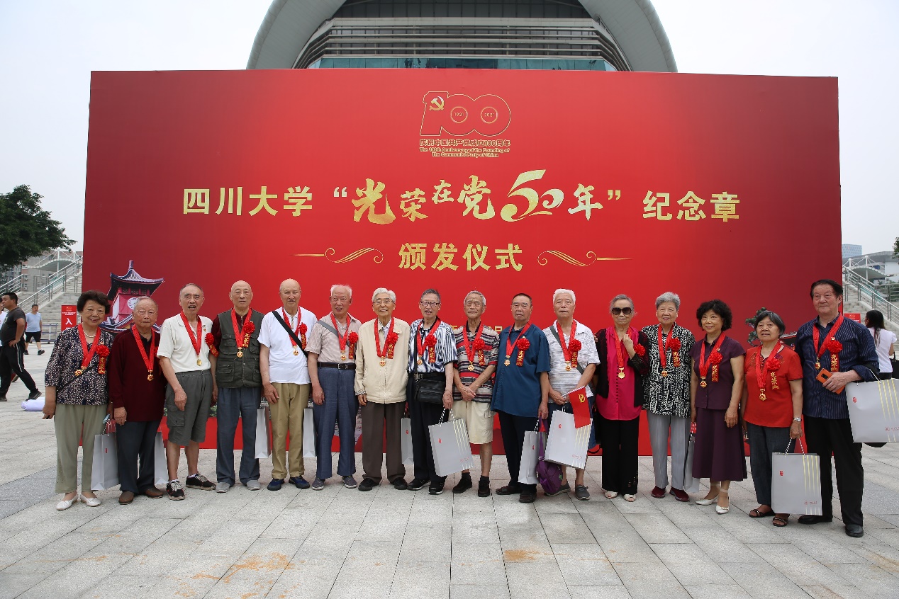 光荣在党50年,入党初心永不移。6月23日,学校“光荣在党50年”纪念章颁发仪式在望江校区体育馆隆重举行。hy3380cc海洋之神刘竟成等18位50年以上党龄老党员代表出席了纪念章颁发仪式。公司党委书记韩芳、党委副书记兼纪委书记张英敏和党政办主任邓丽华陪同参加。