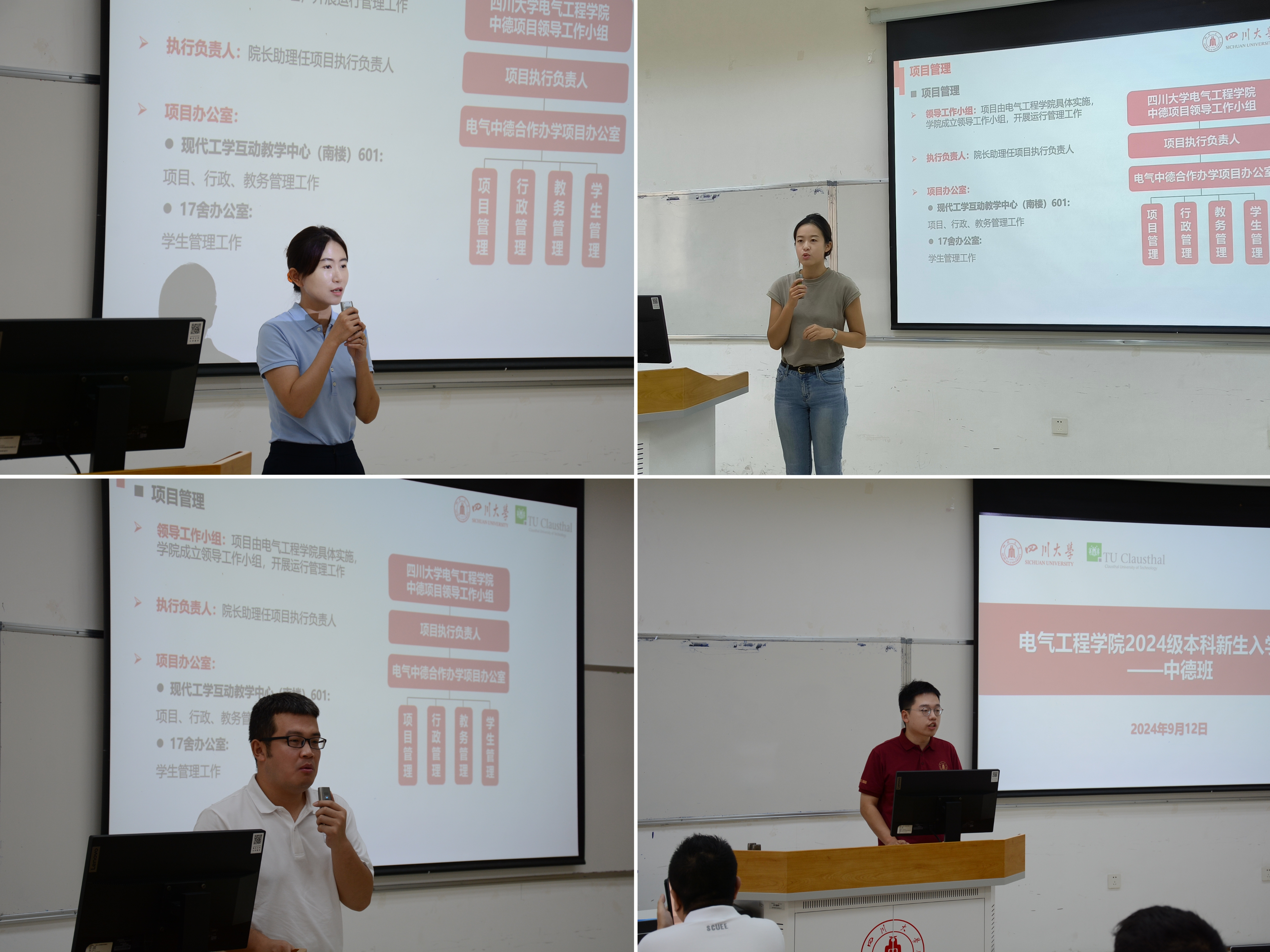 9月12日上午,新生入学教育系列之本科教学专题会在综合楼C408继续进行。由陈实老师主讲,会议内容涵盖项目基本情况、团队团队介绍、培养过程简介以及项目开展情况等四大部分。陈实老师结合历年中德班员工的学习数据,详细讲解了新生入学需要注意的事项,尤其是第一学期的重要性及德语C1水平的关键性。陈老师鼓励新生尽快调整状态,适应大学的学习节奏,树立正确的学习态度和方法,力争取得优异成绩。同学们表示通过这次会议,进一步明确了学习目标和努力方向,对项目要求和学习重点有了更清晰的认识,特别是德语学习的重要性。