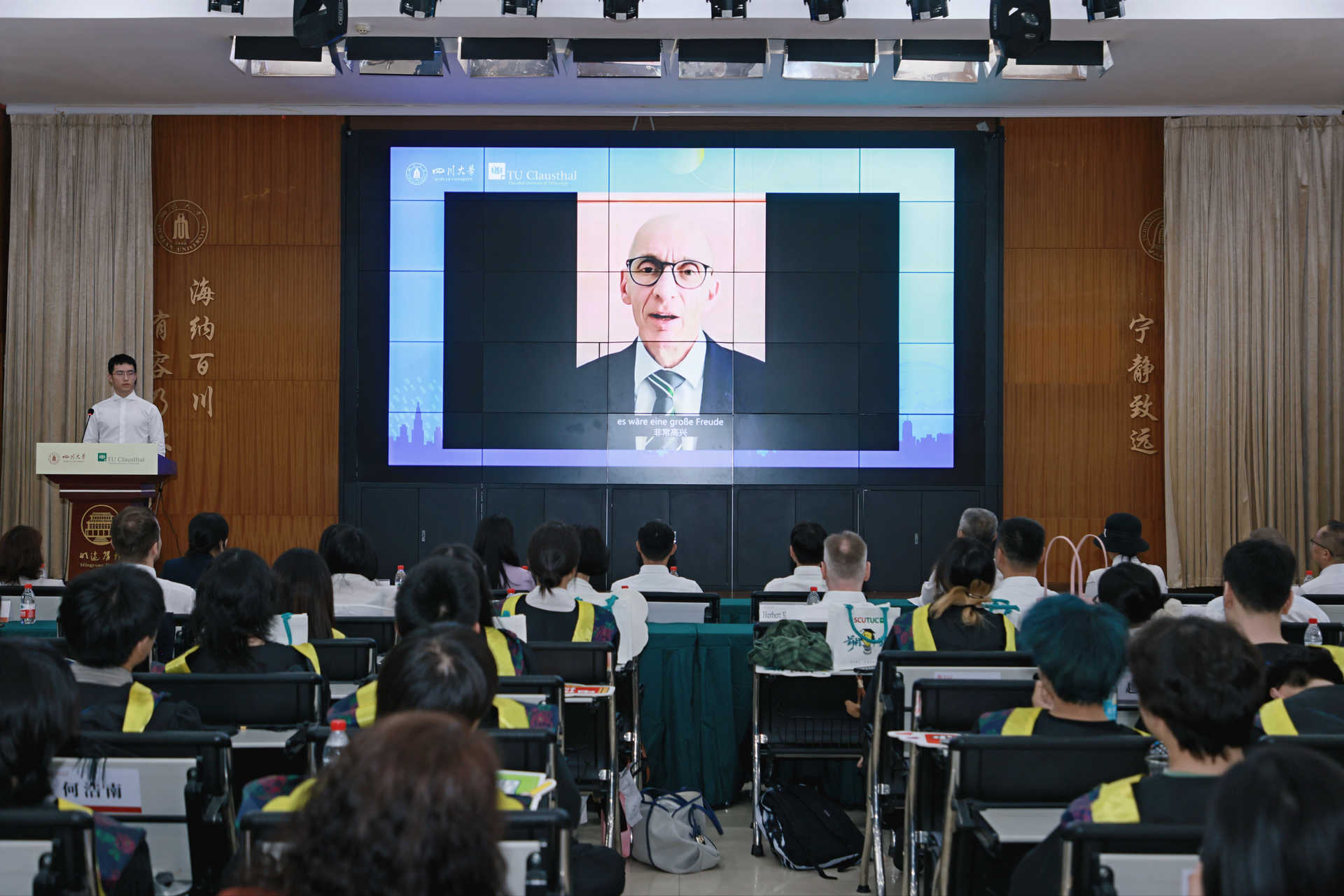 克劳斯塔尔工业大学副董事长Stefan Hartmann、电气工程专业负责人Christian Rembe、中国事务专员兼中国能力中心主任侯正猛分别发表视频致辞。他们充分肯定了中德班首届毕业生的优秀表现,这不仅是个人的重要成就,也是双方国际合作中的一个里程碑。他们鼓励同学们在未来职业发展中不断追求卓越,勇于迎接挑战,保持开放与好奇心,同时对两校今后深化合作表达了良好祝愿,展现了两董事长期友好的合作情谊。