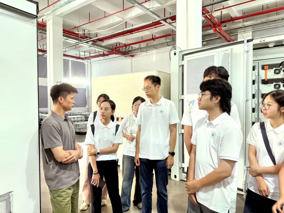 当天下午,实践团驱车前往质点能源位于江门的生产基地。在产品总监薛国威的带领下,师生们参观了现代化生产线,详细了解了产品从原材料加工、核心部件组装到最终检测的全流程质量控制体系。特别是在储能电池组装车间,员工们就工艺细节与技术人员进行了专业探讨,将课堂所学与工业实践进行了深度对接。
